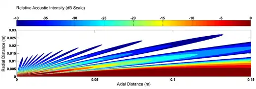 where H(θ) is the directivity function, J1 is the Bessel Function of the first kind, and I(r) is the acoustic intensity in W/m2. Physically the directivity function represents the pressure amplitude for beam angles not parallel to the cylinder axis. It is worthwhile to note that roots of the Bessel function produce certain beam angles with zero amplitude; the regions between these angles are known as side lobes, with the on axis component know as the main lobe. Physically, lobes result from the phase interaction of waves originating from different parts of the cylindrical transducer, and are in some ways analogous to pressure nodes in simple harmonic waves.