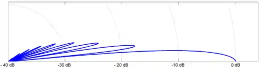 To illustrate the phenomena of side lobes in ultrasound beams, the resulting directivity function and acoustic intensity is calculated for a 1 MHz beam transmitted into water using a 1 cm radius transducer. Figure 2 plots the Directivity function, while Figure 3 plots the acoustic intensity relative to the intensity at the transducer surface.