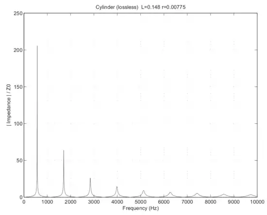 At this point, if we want to have a "quick glance" of the input impedance of a clarinet bore, we may neglect the radiation losses and assume zero load impedance at the open end of the main bore to simplify the problem. We may also neglect the sound absorption due to wall losses. With these simplifications, we can calculate the theoretical input impedance of a cylindrical pipe of length meters and radius meters by Matlab, which is shown in Figure 6.