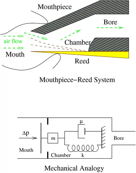 - a mouthpiece-reed system: like an energy source, it produces air flow and pressure oscillating components that fill into the instrument.