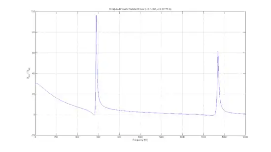 It would be interesting to compare the dissipated power due to the thermal-viscous losses with the radiated power over the clarinet bore. The comparison over the range from 0 Hz to 2000 Hz is simulated in Matlab, where the length of the pipe is 0.148 m and the radius is 0.00775 m, the properties of air is chosen at the temperature of 20 degree. We found the dissipated power is much larger than the radiated power for most frequencies excepts small areas around the resonance frequencies.