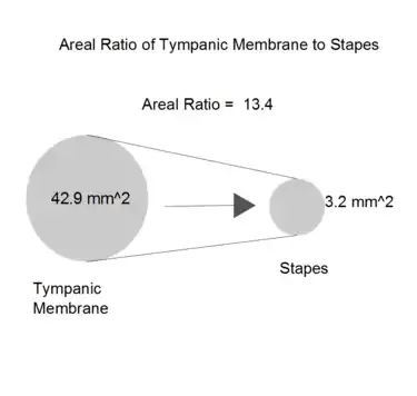 While the ossicular chain helps to increase the pressure of the incoming acoustic signal, the majority of gain in the middle ear is due to the areal ratio of the tympanic membrane and the stapes. The average area of the tympanic membrane is 66 while that of the stapes is 3.2 . The areal ratio between the two areas should therefore be approximately 20:1, but as mentioned earlier the effective area of the tympanic membrane is only 65% so, 66 x 65% = 42.9 . This results in an areal ratio of 13.4.