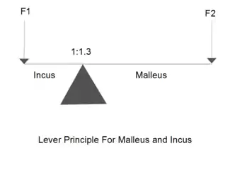The ossicular chain functions like a basic lever. The manubrium of the Malleus is 1.3 times longer than the long process of the Incus, and the two ossicles are connect with ligaments so that they can move together. Their attachment in the middle ear evenly distributes their mass about an axis of rotation which allows them to be easily set into motion by incoming acoustic signals. In addition, the ossicles are damped enough that when the incoming signal is stopped, the malleus and incus stop as well which is desirable as continued motion of the ossicles would lead to echoing. The difference in lengths between the two ossicles also corresponds to a pressure gain at the incus equivalent to the length ratio of the two ossicles. This can be best shown by modeling the two bones as a simple lever: