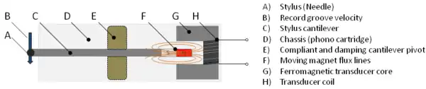 Figure 1 demonstrates this process with a simplified MM cartridge schematic. In this configuration the position of the magnet alters the magnetic domains of the surrounding ferromagnetic transducer core. Similarly, the velocity of the magnet induces a change in the magnetic flux of the transducer core, and according to the principle of electromagnetic induction, a current in the electrical coil is produced.