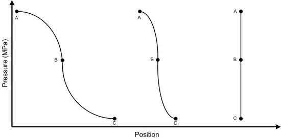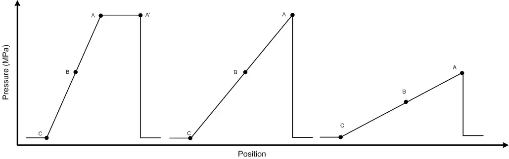 Since the pressure amplitudes are past the regime of linear proportionality between stress and strain the wave speed is no longer constant. By consulting the stress-strain curve it is apparent that wave velocity increases with increasing pressure beyond the elastic limit. Consequently, point C of the waveform will have the lowest local wave speed while points B and A will have consecutively increasing wave speeds. As a result the highest pressure parts of the waveform travel faster than the lower parts and must eventually overtake them. A time lapse of this process is depicted as follows: