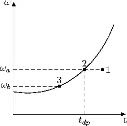 The above plot shows the value of absolute humidity versus the temperature. The initial state of the mixture is 1, and it is cooled isobarically, and at constant absolute humidity. When it reaches 2, it is saturated, and its absolute humidity is ωa. Further cooling causes condensation and the system moves to point 3, where its absolute humidity is ωb. The temperature at 2 is called the dew point.