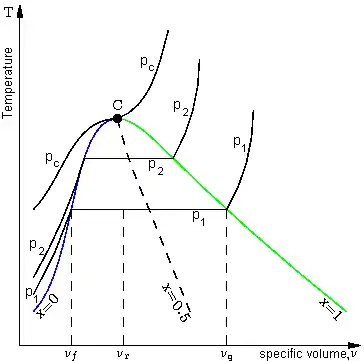 For this analysis, we consider heat transferred to the substance at constant pressure. The above chart shows temperature vs. specific volume (1/density) curves for at three different constant pressures. The three line-curves labeled p1, p2, and pc above are isobars, showing conditions at constant pressure. When the liquid and vapor coexist, it is called a saturated state. There is no change in temperature or pressure when liquid and vapor are in equilibrium, so that the temperature is called saturation temperature and the pressure is called saturation pressure. Saturated states are represented by the horizontal lines in the chart. In the temperature range where both liquid and vapor of a pure substance can coexist in equilibrium, for every value of saturated temperature, there is only one corresponding value of saturation pressure. If the temperature of the liquid is lower than the saturation temperature, it is called subcooled liquid. If the temperature of the vapor or gas is greater than the saturation temperature it is called superheated vapor.