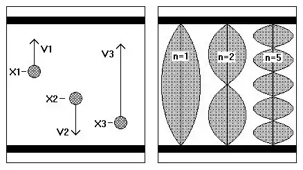 From the point of view of classical mechanics an atom, moving up and down between the two walls, can be at any level x and have any velocity v and consequently the number of different ’states’ would be undefined. On the other hand in quantum mechanics, dealing with standing waves only, the number of possible states is well-defined, states in between being impossible.