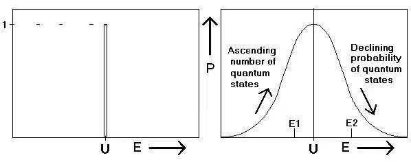 In both figures the vertical coordinate is the probability of a system to be at energy level E. The left hand picture displays the situation in an ‘isolated’ system, P being unity: the system is always at the energy level U. The right hand picture gives the situation in the same system, being in equilibrium with a heat bath. Due to thermal motion its energy is fluctuating about the mean value U. The fluctuations are so small that they can not be detected calorimetrically, but on an atomic scale they are important.