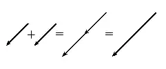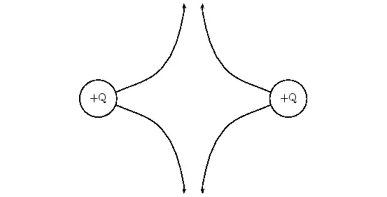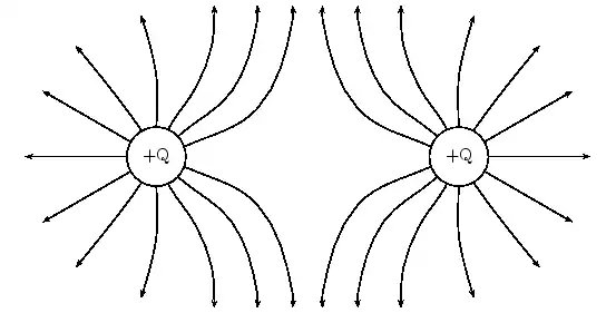 For the case of two positive charges things look a little different. We can't just turn the arrows around the way we did before. In this case the test charge is repelled by both charges. This tells us that a test charge will never cross half way because the force of repulsion from both charges will be equal in magnitude.