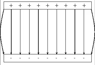 This means that the force that a would feel at any point between the plates would be identical in magnitude and direction. The fields on the edges exhibit fringe effects, i.e. they bulge outwards. This is because a test charge placed here would feel the effects of charges only on one side (either left or right depending on which side it is placed). Test charges placed in the middle experience the effects of charges on both sides so they balance the components in the horizontal direction. This isn't the case on the edges.
