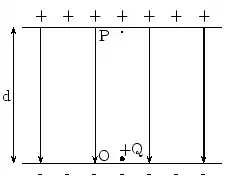 This electric field is uniform so that a charge placed anywhere between the plates will experience the same force. Consider a positive test charge Q placed at point O just off the surface of the negative plate. In order to move it towards the positive plate we have to apply a force QE. The work done in moving the charge from the negative to the positive plate is,