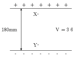 Question: Two charged parallel plates are at a distance of 180 mm from each other. The potential difference between them is as shown in the diagram.