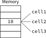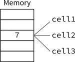 cell1, cell2, and cell3 are all pointing to the same address in memory. The .contents property of each cell is 7. Let's say, at some point in our program, we execute the code cell1 := 10, this changes the value in memory to the following: