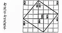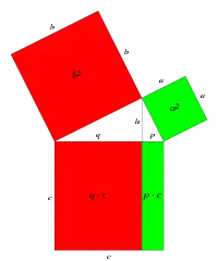 The proof is very simple, as one sees from the graphic one constructs first a square formed by four triangles and by two squares, one of side a and the second of side b. The area of a square is calculated multiplying the side by itself or in modern notation the area is the side raised to the power two. The area of the large square is therefore the sum of the areas of the squares values a2 and b2 plus the sum of the four triangles. In the second square we have again four triangles and a square of area c2. The four triangles being present both to the left of the equality and to the right can be eliminated. Therefore remaining in the equation: