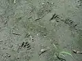 The hind foot prints are deeper than the front because it carries most of the raccoon's weight. The hind foot has an elongated heel, while the heel of the front foot does not generally print at all. The "palm" of the front foot may be shaped like the letter "C", while the print of the hind foot looks somewhat like a human baby's hand print. The left front foot prints next to the right hind foot and vice versa.