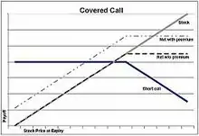 A covered call is a financial market transaction in which the seller of call options owns the corresponding amount of the underlying instrument, such as shares of a stock or other securities. If the trader buys the underlying instrument at the same time as he sells the call, the strategy is often called a "buy-write" strategy. In equilibrium, the strategy has the same payoffs as writing a put option.