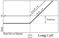 A trader who believes that a stock's price will increase might buy the right to purchase the stock, which is called a call option, rather than just purchase the stock itself. He would have no obligation to buy the stock, only the right to do so until the expiration date. If the stock price at expiration is above the exercise price by more than the premium (price) paid, he will profit. If the stock price at expiration is lower than the exercise price, he will let the call contract expire since it is worthless, and only lose the amount of the premium. A trader might buy the option instead of shares, because for the same amount of money, he can control a much larger number of shares.