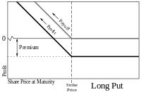 A trader who believes that a stock's price will decrease can buy the right to sell the stock at a fixed price a put option. He will be under no obligation to sell the stock, but has the right to do so until the expiration date. If the stock price at expiration is below the exercise price by more than the premium paid, he will profit. If the stock price at expiration is above the exercise price, he will let the put contract expire worthless and only lose the premium paid. The put option holder's profit per unit is