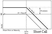 A trader who believes that a stock price will decrease, can sell the stock short or instead sell, or "write," a call. The trader selling a call has an obligation to sell the stock to the call buyer at the buyer's option. If the stock price decreases, the short call position will make a profit in the amount of the premium. If the stock price increases over the exercise price by more than the amount of the premium, the short will lose money, with the potential loss unlimited. The profit for the writer of a call option is