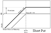 A trader who believes that a stock price will increase can buy the stock or instead sell, or "write", a put. The trader selling a put has an obligation to buy the stock from the put buyer at the put buyer's option. If the stock price at expiration is above the exercise price, the short put position will make a profit in the amount of the premium. If the stock price at expiration is below the exercise price by more than the amount of the premium, the trader will lose money, with the potential loss being up to the full value of the stock. A benchmark index for the performance of a cash-secured short put option position is the CBOE S&P 500 PutWrite Index (ticker PUT). The profit for the writer of a put option is