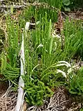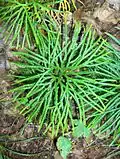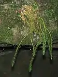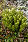 | The Huperzioideae, known as firmosses, have also been treated as a separate family Huperziaceae. Firmosses differ from other Lycopodiaceae in that they grow in clumps, instead of producing creeping, horizontal stems like other family members.[1] Of the three genera in this group, Huperzia is a temperate and arctic genus and is the only one found naturally in New York. Of the other two genera, Phlegmariurus is native to tropical and subtropical regions, and Phylloglossum is native to Australia and New Zealand.