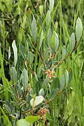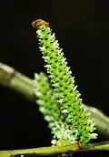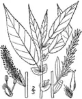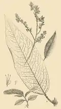 | Salix subg. Salix sect. Salicaster contains about nine species worldwide with four of those (S. lasiandra, S. lucida, S. pentandra, and S. serissima) found in North America.[1] Of those, S. lucida (shining willow) and S. serissima (Autumn willow) are native to New York. Reports of the Eurasian S. pentandra (laurel willow) in New York are now considered to be S.×meyeriana (S. euxina × S. pentandra), Meyer's willow.[2]