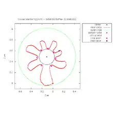 f(z,c):=z*z+c $ GiveCriticalOrbit(c,iMax):= block( ER:2.0, /* Escape Radius */ z:0+0*%i, /* first point = critical point */ orbit:[z], if (abs(z)>ER) then return(orbit), i:0, loop, /* compute forward orbit */ z:rectform(f(z,c)), orbit:endcons(z,orbit), i:i+1, if ((abs(z)<ER) and (i<iMax)) then go(loop), return(orbit) )$ /* find fixed point alfa */ GiveFixed(c):= float(rectform((1-sqrt(1-4*c))/2))$ /* distance between point z and fixed point zf */ GiveDistanceFromCenterTo(z):= abs(z-zf)$ /* inner radius of Siegel Disc ; criticla orbit is a boundary of SD */ GiveInnerRadiusOf(orbit):=lmin(map(GiveDistanceFromCenterTo,orbit))$ /* outer radius of Siegel Disc ; criticla orbit is a boundary of SD */ GiveOuterRadiusOf(orbit):=lmax(map(GiveDistanceFromCenterTo,orbit))$ /*------------ const ---------------------------------*/ c:0.113891513213121 +0.595978335936124*%i; /* fc(z) = z*z + c */ NrPoints:400000; /* ----------- main ---------------------------------------------------*/ zf:GiveFixed(c); /* fixed point = center of Siegel disc */ orbit:GiveCriticalOrbit(c,NrPoints)$ innerRadius: GiveInnerRadiusOf(orbit) ; outerRadius: GiveOuterRadiusOf(orbit) ;