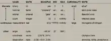 A particularly complicated kind of measurement results in various kinds of categories, which require often sophisticated analytical techniques. One example would be assigning a human patient to the class of patients suffering from West Nile Virus, which can be considered an anatomical condition (brain inflammation), an infection by a specific Flavivirus, or a collection of symptoms (fever, etc.). Measurement problem - issues of reliability and confidentiality - are among the reasons why epidemiological data description is so challenging. It is useful to explore some of the unusual conditions that arise in the treatment of real numbers.