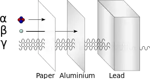 Gamma (γ) radiation consists of photons with a frequency of greater than 1019 Hz.[1] Gamma radiation occurs to rid the decaying nucleus of excess energy after it has emitted either alpha or beta radiation. Both alpha and beta particles have an electric charge and mass, and thus are quite likely to interact with other atoms in their path. Gamma radiation is composed of photons, and photons have neither mass nor electric charge. Gamma radiation penetrates much further through matter than either alpha or beta radiation.
