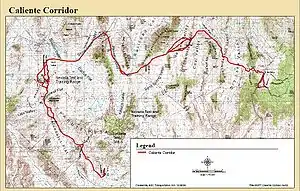 Within Nevada, the planned primary mode of transportation is via rail through the Caliente Corridor. This corridor starts in Caliente, NV, travelling along the western and northern borders of Nevada for approximately 200 miles (320 km). At this point, it turns south to reach Yucca Mountain.[23]