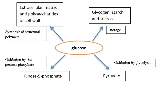 Glucose occupies a central position in the metabolism of plants, animals and many microorganisms. It has relatively high potential energy and therefore it is a good fuel: the full oxidation of one molecule of glucose to carbon dioxide and water occurs in a range of standard free energy of - 2840 kJ/mol. By means of storage of glucose as a polymer of high molecular mass, such as starch and glycogen, the cell can store large quantities of hexose units while maintaining the cytosolic osmolarity relatively low. When the demand for energy increases, glucose can be converted from such intracellular storages into adenosine triphosphate (ATP) in an aerobic or anaerobic manner. (Nelson, D & Cox, M. 2011; Stryer, L. 2008).