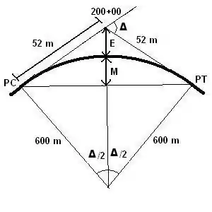 With this radius, practitioners can determine the degree of curve to see if it falls within acceptable standards. Degree of curve, , can be computed through the following formula, which is given in Metric.