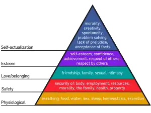 Maslow's hierarchy of needs, represented as a pyramid with the more basic needs at the bottom.