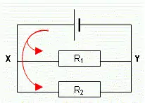 Parallel circuits are a bit more complicated than series circuits, because they contain a branch - the electric current will take more than one route. Look at the diagram. At point X the current splits into 2 paths, and flows through both resistor R1 and resistor R2. It may not split in equal amounts. When several(two or more) components are connected in parallel branches, the voltage (potential difference) across each parallel branch is the same. And this is the same as the voltage across the battery.