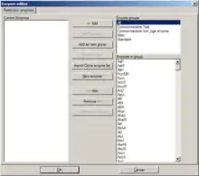 Enzymes can be copied into/removed from the left list through the <--Add and Remove--> buttons. Enzymes can be deleted from a group (except All) via Delete from group, or added via New enzyme. A double click on an enzyme name in either list shows an enzyme properties dialog.