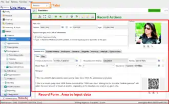 - Record form : This is where you see and input the information. Notice that you can have tabbed forms (notebooks) in the lower half of the form, which allows quick and easy navigation. In this example some of the tabs within the records are main, medication, diseases, surgeries, socioeconomics and gynecological information. The upper side of this form is static, so the health professional has the most relevant information about the patient always visible.