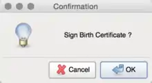 If you create a birth certificate record it will have the Draft state by default. You can switch to the Signed state by clicking the Sign button. You will be prompted to confirm that you want to sign the birth certificate; please note that signing a birth certificate can not be undone. Signing a birth certificate will add the name of the certifier (the health professional) plus date and time of the signing process.
