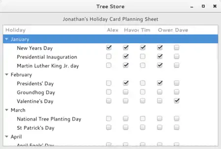 Tree model implementations like GtkListStore and GtkTreeStore will take care of the view side for you once you have configured the GtkTreeView to display what you want. If you change data in the store, the model will notify the tree view and your data display will be updated. If you add or remove rows, the model will also notify the store, and your row will appear in or disappear from the view as well. 3.1. How Data is Organised in a Store