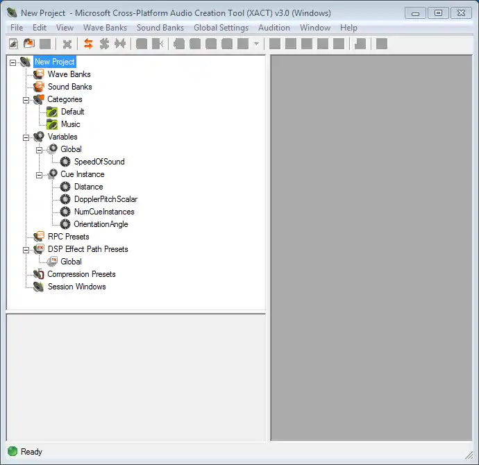 XACT’s Graphical User Interface is known as Authoring Tool and is a part of the XNA Game Studio and the DirectX Software Development Kit. It lets you organise sounds in logical units, so they can be accessed easily by name with the API afterwards. Microsoft’s goal was to make the process of organizing the sounds as easy as possible. Designers can edit the sounds without writing any code.
