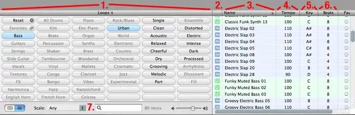 - This column is a filter for all the loops. You can click on the buttons to filter the loops out that you want. In this case 'Urban Bass' loops which show up on the right side of the panel.