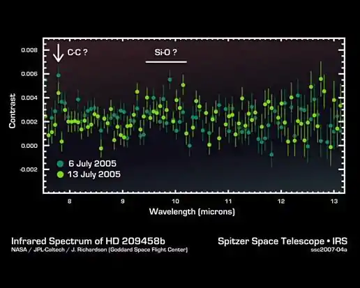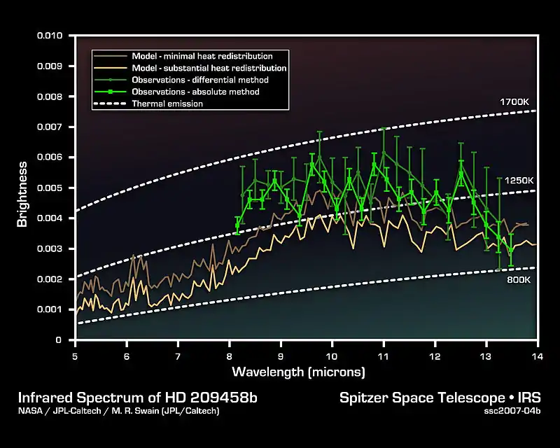 Astrophysicists have recently observed spectra from hot Jupiter sized planets in planetary systems many light years away.[20] Since these planets are so distant, it’s not as simple as just looking at the planet and collecting data about the direct light from the planet.[21] The planets are too distant for such techniques and they are too close to their parent stars (sometimes closer than Mercury is to our sun).[21] Instead astrophysicists collect data from the star and planet during different parts of the planets’ orbit and separate the light from just the planet.
