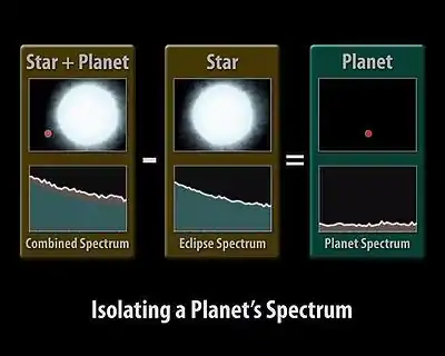 First the spectrum from the planet and star is collected. This is done when, as seen from earth, both planet and star are at their greatest separation. Then the spectrum of just the star is obtained. This is done when the planet is either directly in front of the parent star (primary eclipse) or directly behind its parent star (secondary eclipse). By subtracting the light of the star from the light of the star plus planet, the spectrum of the planet can be found.[21]