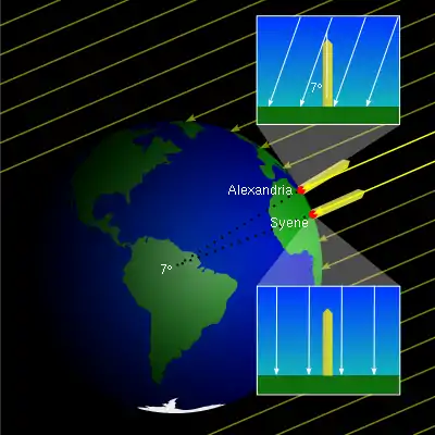 In the third century BC, the Hellenistic Egyptian scholar Eratosthenes served as head of the library of Alexandria, where he studied and wrote on a variety of subjects. During his studies, Eratosthenes learned that the Sun cast no shadow on midday of the summer solstice from the city of Syene. From Alexandria, Eratosthenes observed that the Sun did cast a shadow, and he measured that the angle between the Sun and the zenith was about seven degrees when the Sun was highest in the sky.