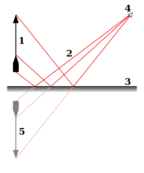 | In this illustration, the reflected light rays reaching the eye from an object produce the illusionary appearance of a reversed-image object behind the mirror. |