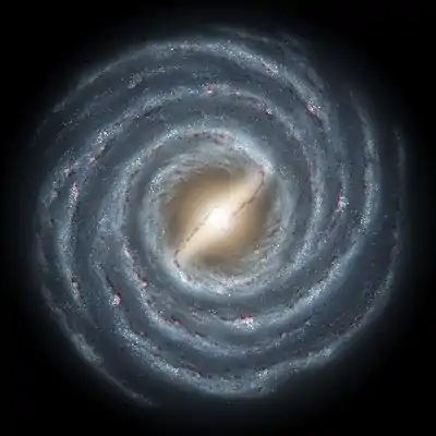 Like the Solar System, the Galaxy is shaped like a flat disk, but the Galaxy is much bigger. Our galaxy contains hundreds of billions of stars, and the Solar System is only one member contained inside. The Sun is located in the spiral arms of the galaxy about two thirds of the way from the center, and it orbits around the center of the galaxy with all the other stars. If the Milky Way were fifty miles long, the Solar System would only be a dot the size of the tip of a ball point pen. In actuality, the Galaxy is 100,000 light-years across, but only a few thousand light-years thick.
