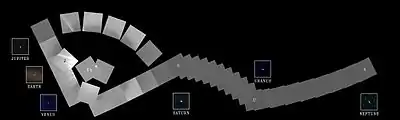 Remember that our size scale has increased from the last step by a huge factor, a factor of 1000. Using our jet to take a trip from Earth to Saturn would take about fifty years. Light takes about 80 minutes to travel from Saturn to Earth, depending on where Earth and Saturn are in their orbits. Because it takes so long for light to make the trip from Saturn, the light we see from the planet at a given moment actually left 80 minutes ago. This means that we don't see Saturn as it is presently, but as it was 80 minutes ago. This also means that looking out into space is like looking back in time. The farther we look, the older the light. This is not very important for Saturn, but it will become more important as the size scale increases.