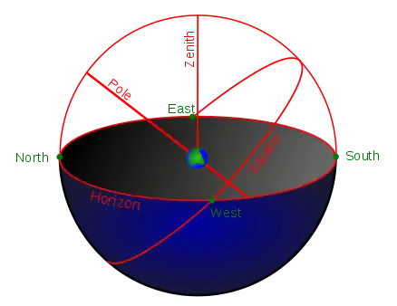 The celestial equator is an extension of the Earth's equator onto the celestial sphere. If you stand on Earth's equator, the celestial equator will always be directly overhead and pass through the zenith. It will run from the East point up to the zenith and down again to the West point. Anywhere you stand on Earth, the celestial equator will intersect the East and West points on the horizon. The nearer you are to the equator, the nearer the celestial equator come to the zenith. At the North Pole or the South Pole, the celestial equator lines up with the horizon.