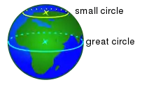 - A great circle is a circle drawn on the celestial sphere (or any sphere) which has the center of the Earth as its center. On the Earth, the equator is an example of a great circle. Other lines of latitude are not great circles because their center is not at the center of Earth. Lines of longitude are all great circles because they are always centered on Earth's center. A great circle is the largest possible circle that can be drawn on a sphere.