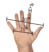For casual stargazing, observers think about much larger angles. You can easily measure these angles when stargazing by using your hand as your ruler. From arm's length, your index finger has a width of about one degree, your palm measures about ten degrees across, and your full finger-span, including your thumb, is about 25°. This can be useful for estimating the position of a star in the sky, or for gauging the angular separation of two stars.
